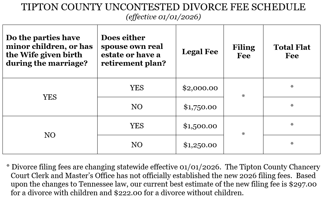 The following uncontested divorce fee schedules are effective January 1, 2026 and are subject to change. This pricing involves an extremely specific definition of “uncontested divorce,” and not all cases are suitable for uncontested divorce. Note: If you do not have any children and reside in a different county, you and your spouse may be able to sign a waiver prior to filing that allows us to file in Tipton County, resulting in financial savings to you. Note: this does require the cooperation of both spouses.